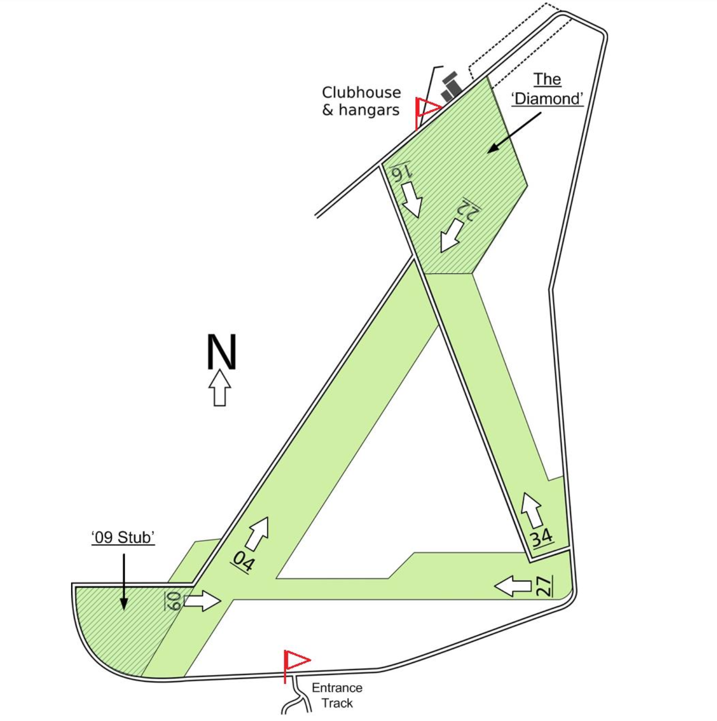 GRL has 3 runways and 2 additional landable areas. Upon entering the gravel track and reaching the first windsock, please turn right along the entrance track.