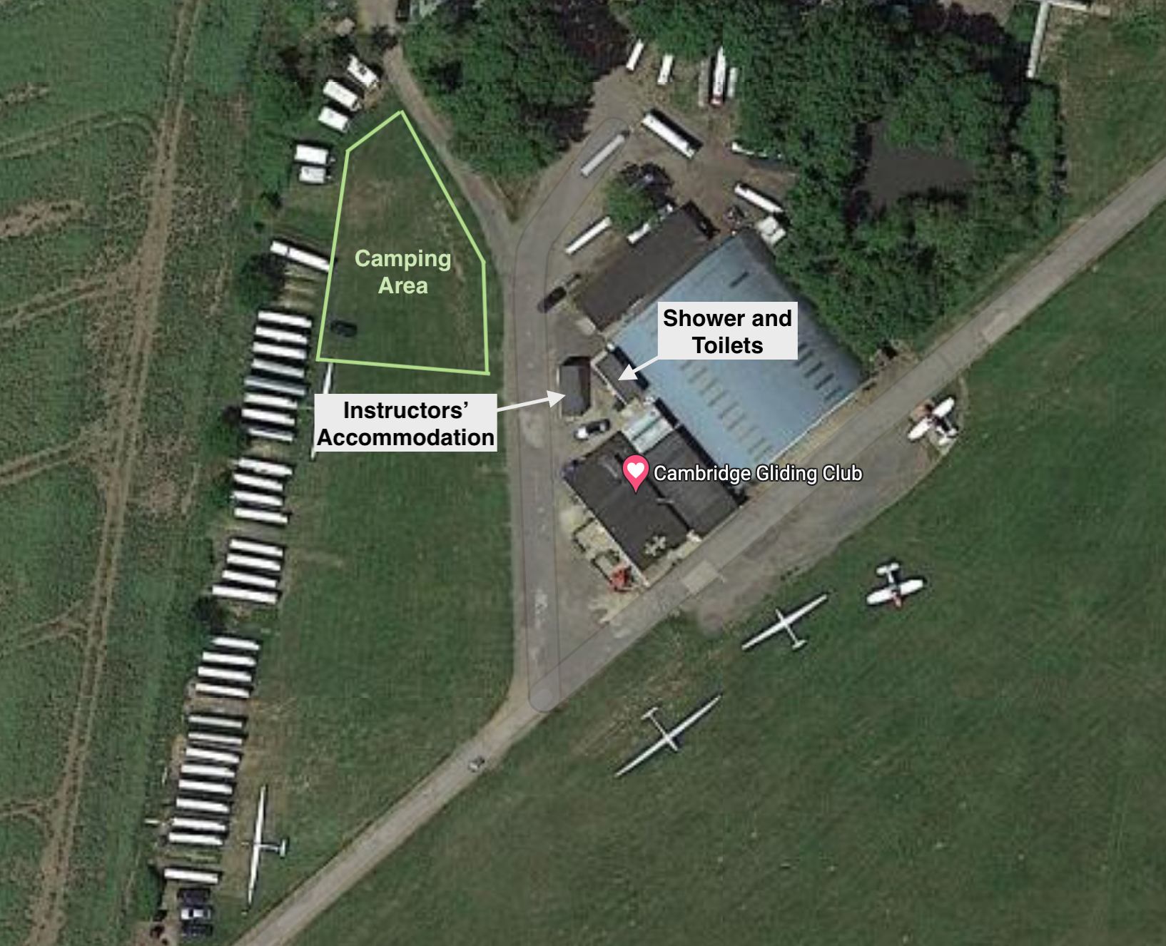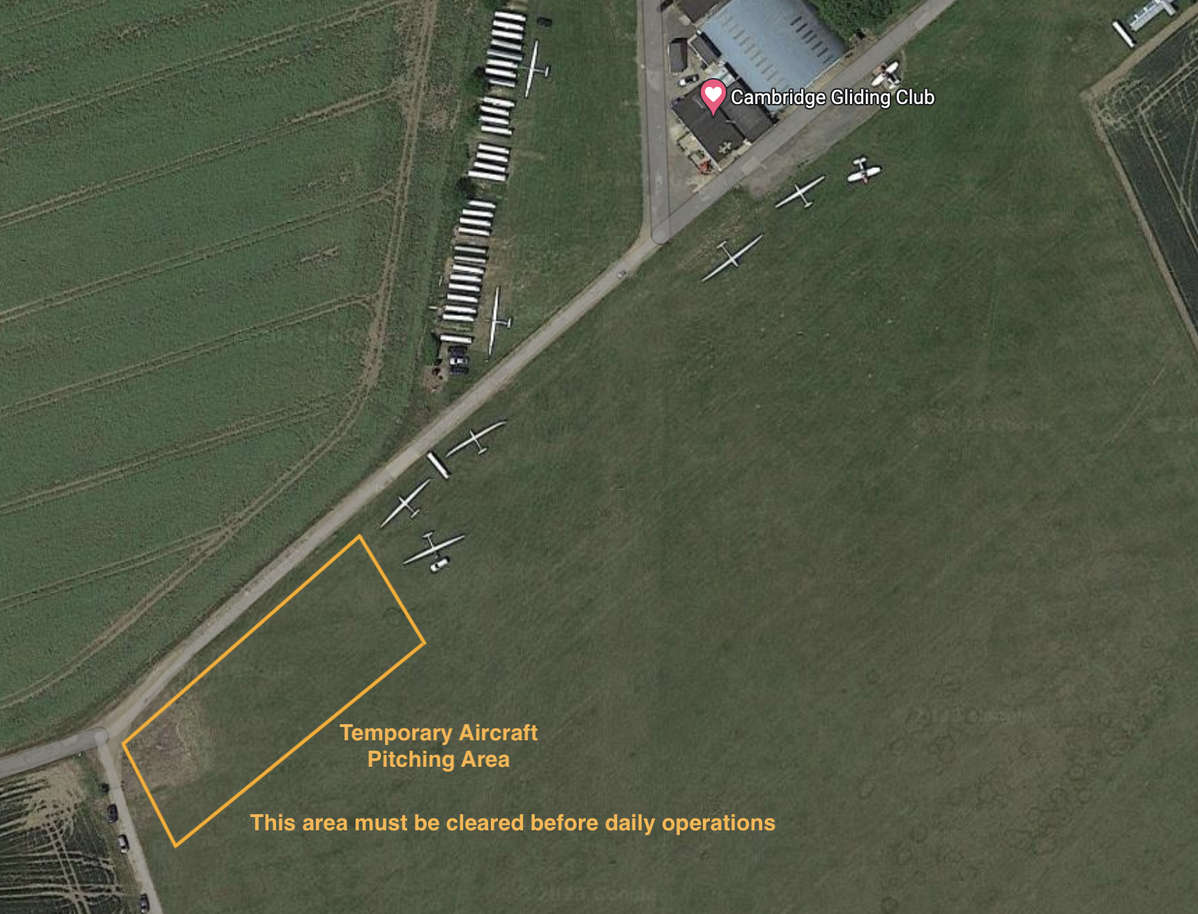 The orange area can be used to pitch 2-seaters overnight, but the area is part of an active runway and must be cleared before daily operations. You will see other gliders pitched alongside, but those are paid-for spots by full members of Cambridge Gliding Centre.